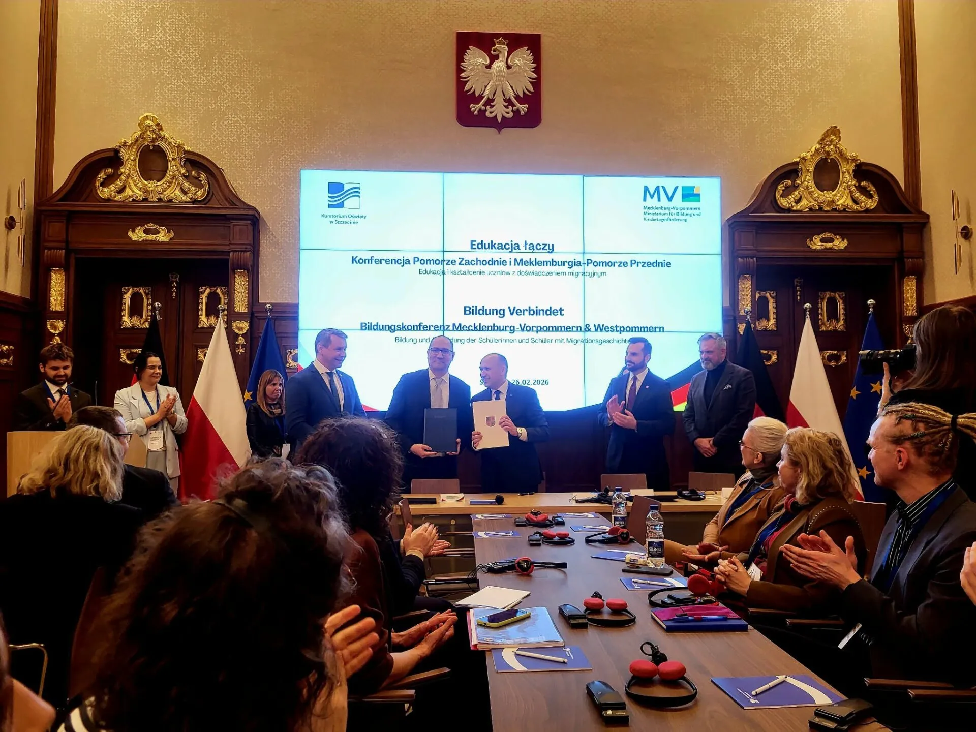 W dniu 26 lutego w siedzibie Zachodniopomorskiego Urzędu Wojewódzkiego odbyła się konferencja polsko-niemiecka poświęcona wyzwaniom i rozwiązaniom w zakresie edukacji uczniów – cudzoziemców z doświadczeniem migracyjnym. Wydarzenie zostało zorganizowane z inicjatywy Zachodniopomorskiego Kuratora Oświaty Pawła Palczyńskiego oraz Sekretarza Stanu w Ministerstwie Edukacji i Opieki nad Dziećmi kraju związkowego Meklemburgia–Pomorze Przednie Toma Michaela Scheidung.