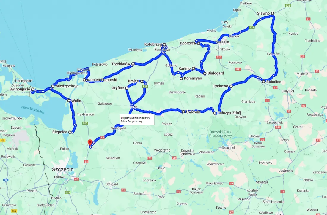 Stepnica – Wolin – Świnoujście – Międzyzdroje – Kamień Pomorski – Trzebiatów – Kołobrzeg – Domacyno – Karlino – Białogard – Dobrzyca – Sławno – Bobolice – Tychowo – Połczyn-Zdrój – Świdwin – Gryfice – Brojce – Goleniów
