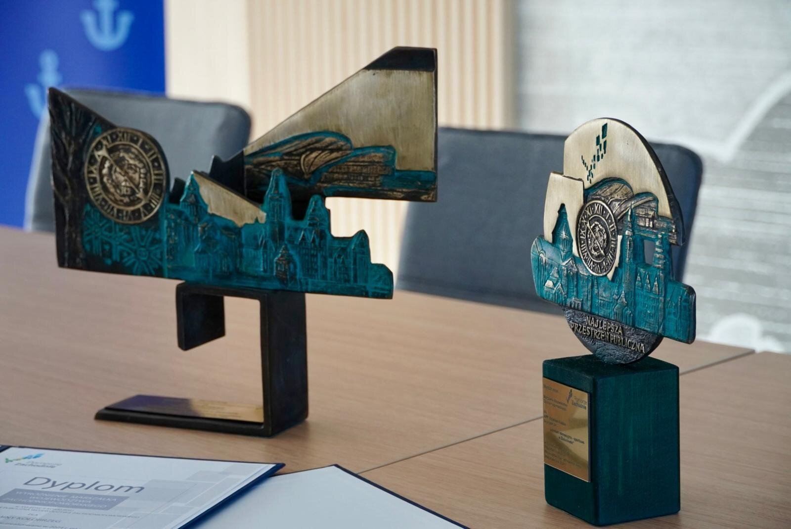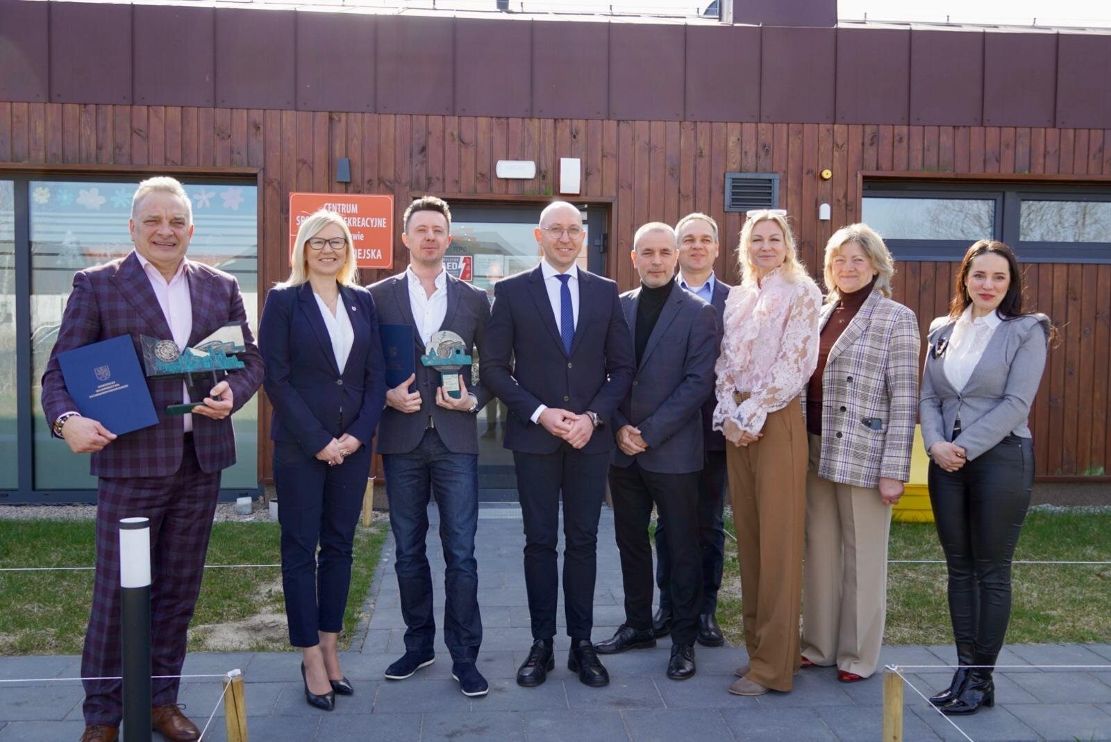 Wyróżnienie przyznane w kategorii najlepszy obiekt użyteczności publicznej odebrali od wicemarszałków Jakuba Kowalika i Anny Bańkowskiej Wójt Gminy Kołobrzeg Jerzy Wolski oraz projektant Autorskiej Pracowni Projektowej Krystian Kubiak.
